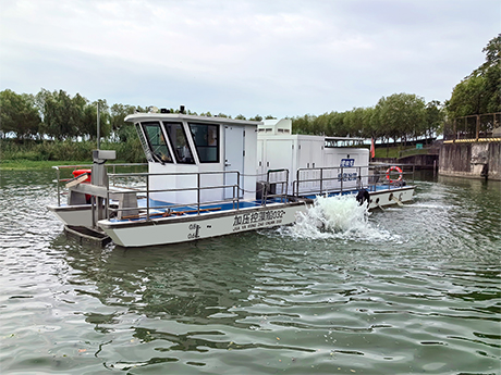 公司研發的加壓控藻船,以玻璃鋼船體為平臺,配置藍藻打撈、壓力控藻和曝氣裝置...